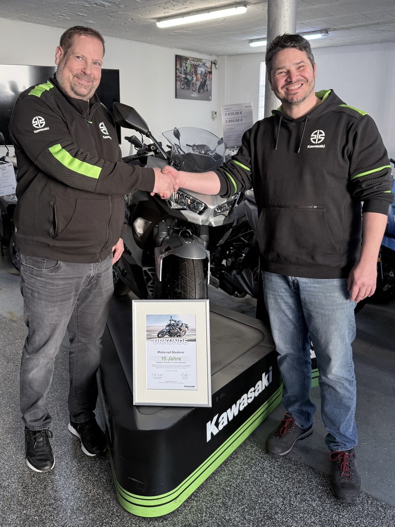 Andreas Niederer bekam die Ehrenurkunde von Torsten Schwartz, District Manager von Kawasaki überreicht.